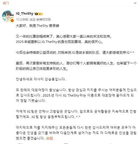 最后,再次谢谢所有支持我的人,愿你们每个人都拥有美好的人生,也希望下一个阶段的我让自己体验更多彩的人生。#iG官宣TheShy离场#